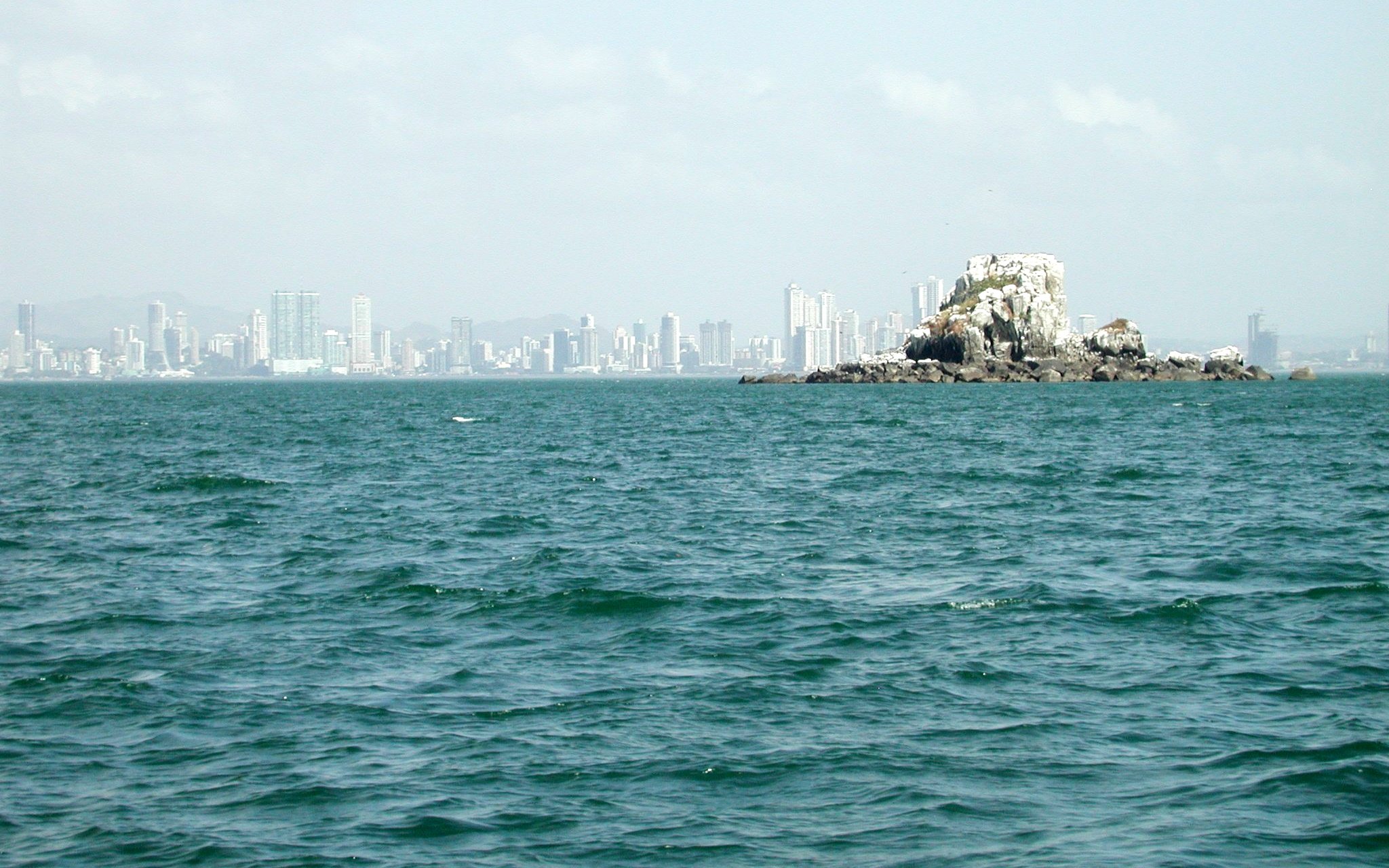 Panama City, with its impressive skyline; in front is an outlying rock off Isla Flamenco.