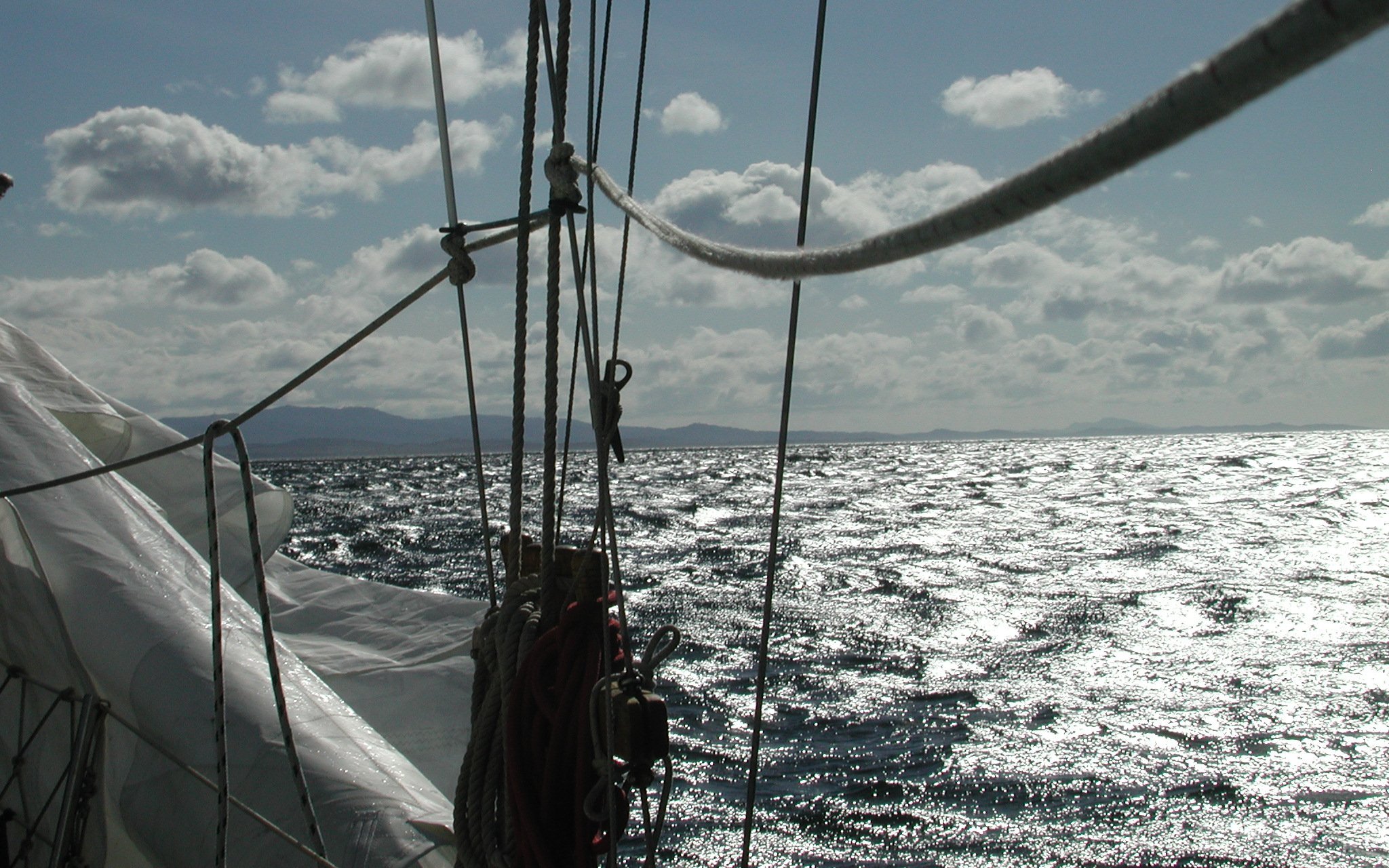 Wild weather (in the midst of lowering the jib). Attempting to get past Masachapa for the first time; we had to do some heavy-weather sail changing. That's the jib hanging over the lifelines as it's being lowered.