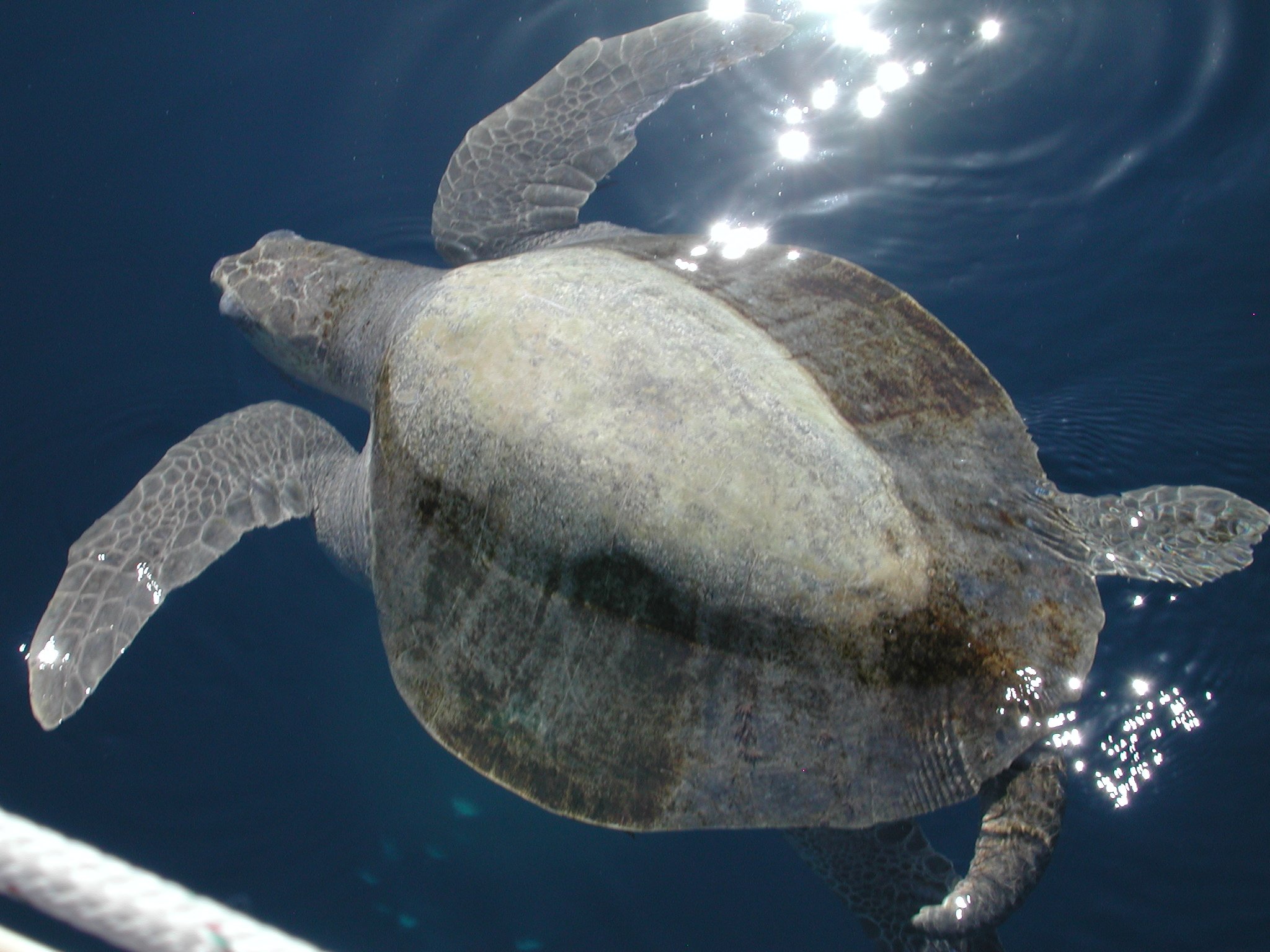 Sea turtle lounging. We coasted gently up to this turtle with the engine off, and he didn't realise we were there until he was alongside the bowsprit -- where we took this picture.