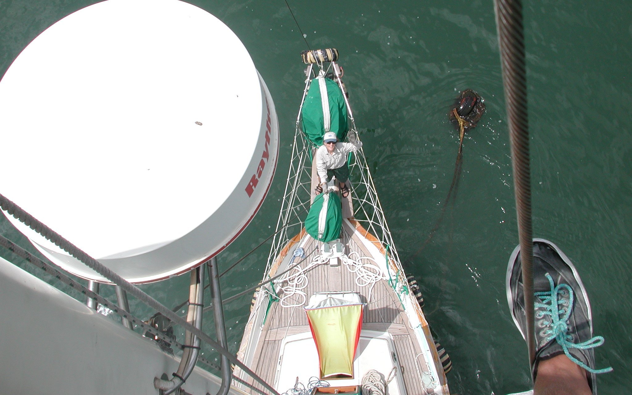 Looking down on Rachel, while up the mast. The radar dome is below me. You can see the mooring buoy (two old tyres) that we're moored to top right.