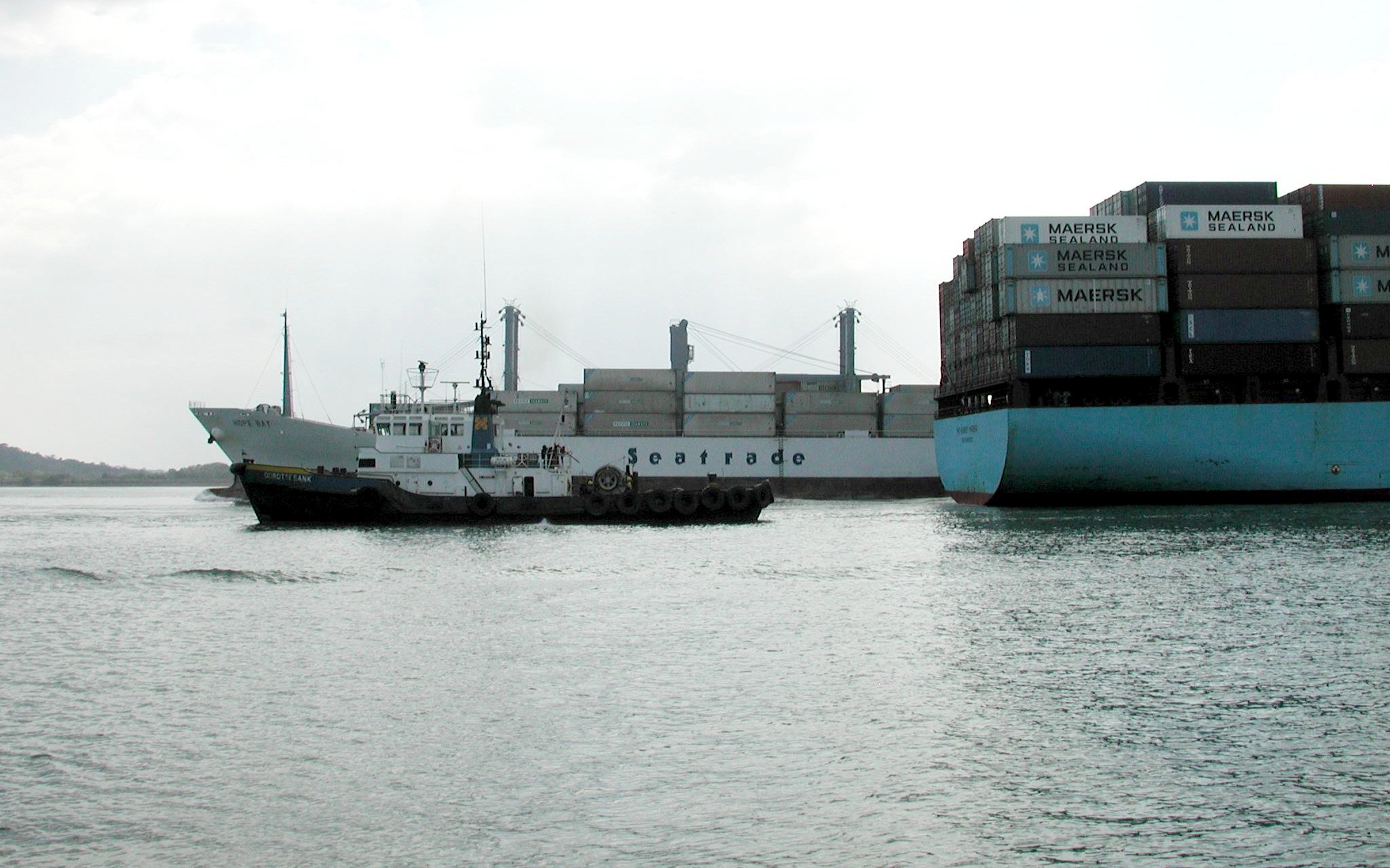Two ships and a tug passing in front of the Balboa Yacht Club. Moonrise was moored on the third row of boats in from the channel, and even so we were just 100 yards from the edge of the channel. The canal is to the right.