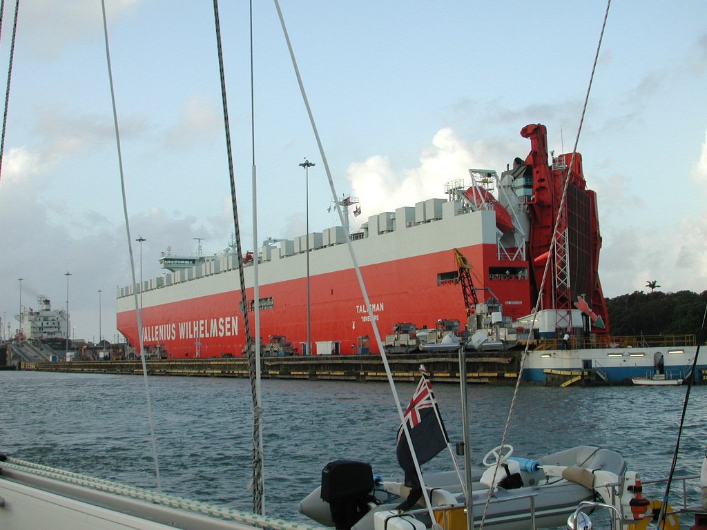 Practice transit: Talisman, a huge car carrier, going up the west chamber. A massive car carrier going up the parallel set of locks to ours.