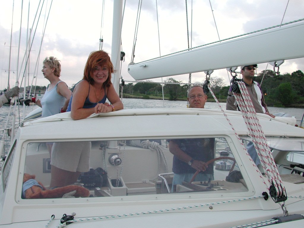 Practice transit: Sue, Marguerite, Benno, and Orlando. Sue standing by, and Marguerite in the cockpit with Benno at the helm as the raft waits for the lock. Marguerite and Benno own Doctor Bird, a Swiss boat, named for the national bird of Jamaica.