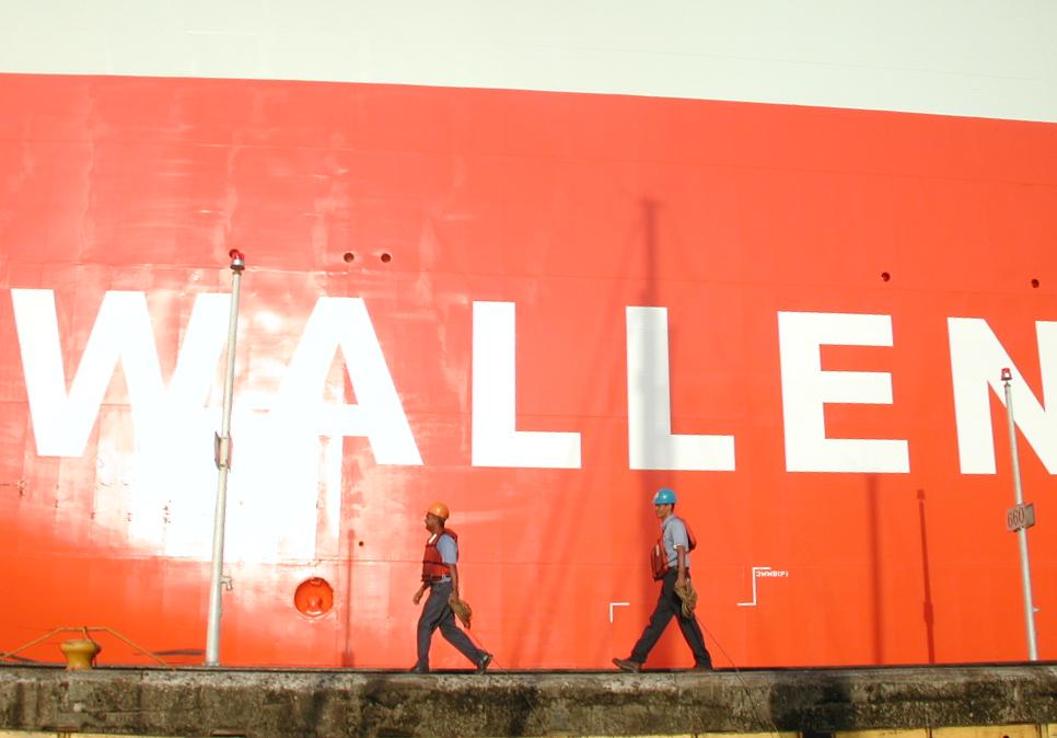 Practice transit: Our line handlers, on the lock approach wall. Our line handlers on the lock wall, carrying the messenger lines (which we have already caught); behind them is Talisman, a huge car carrier.
