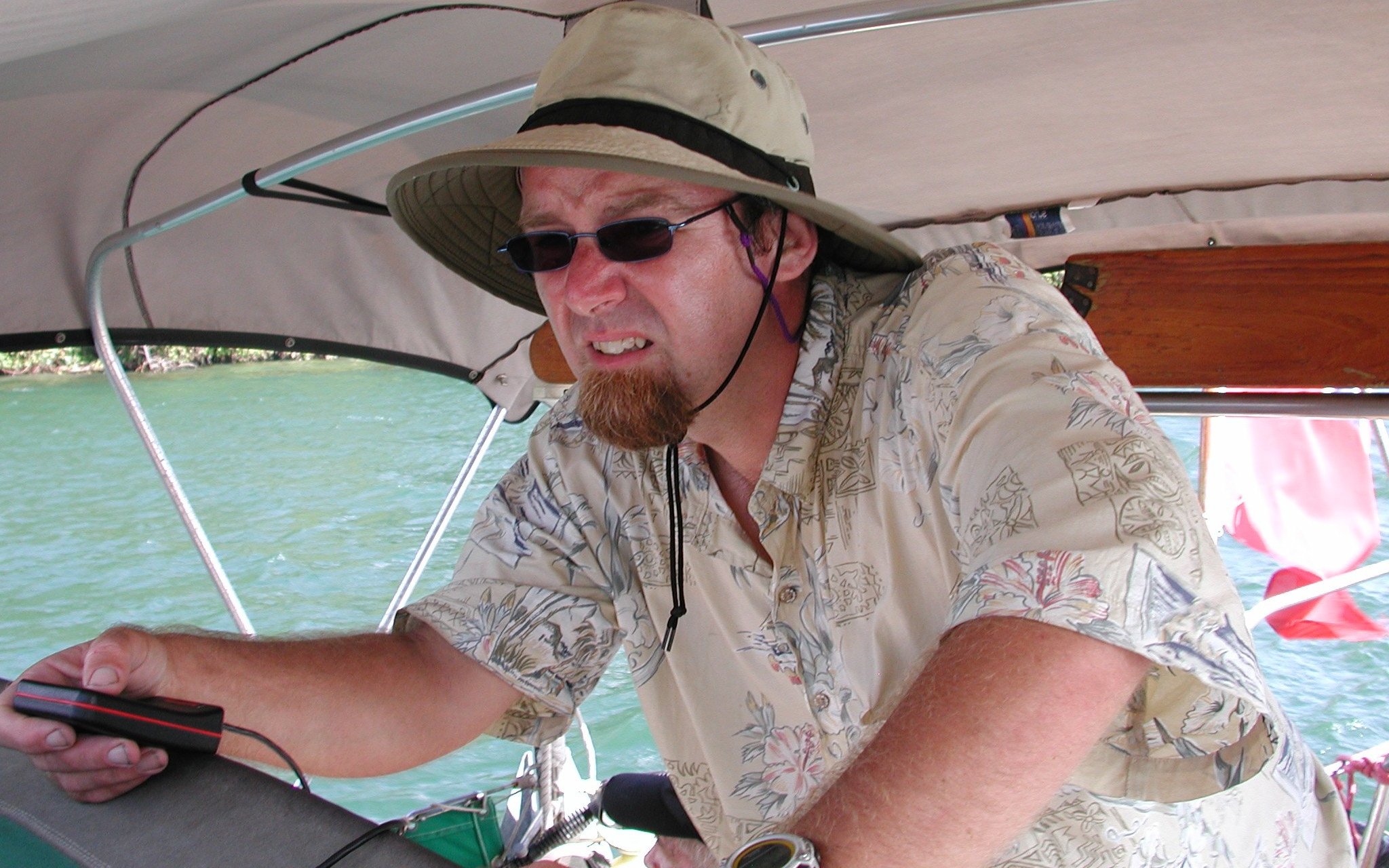 The captain steering (by remote). The remote control on the autopilot is very handy for fine steering in narrow quarters at top speed, which is already tense enough, as you can see by the captain's look of intense concentration.
