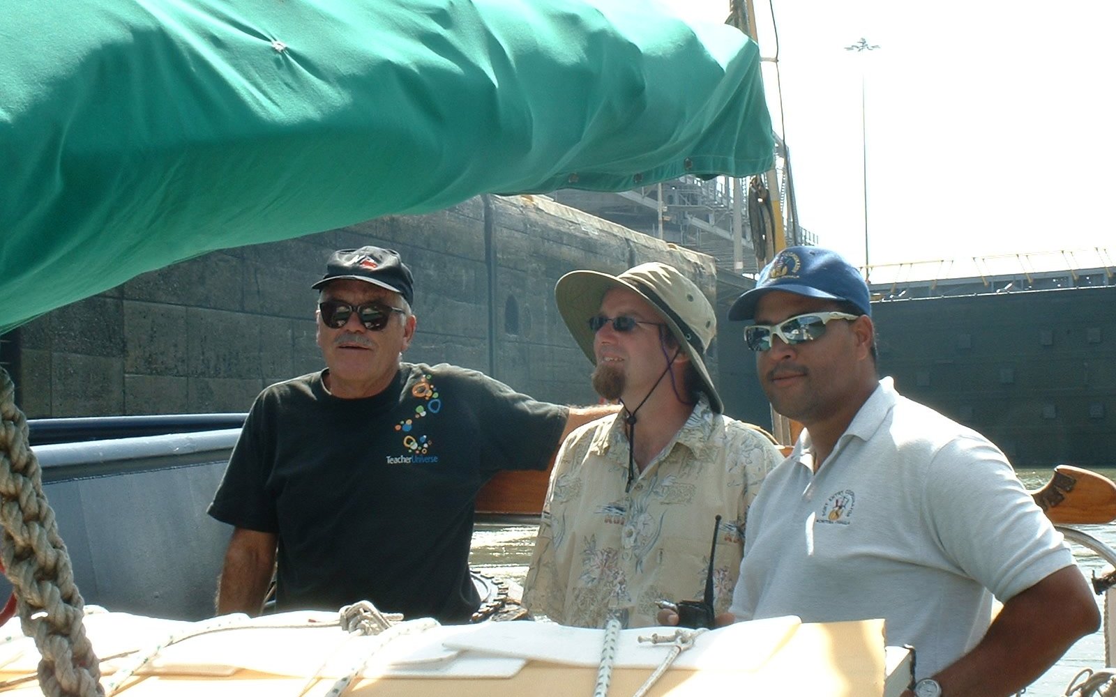 The skipper and crew, locking up. Dick, our volunteer line handler; Ian, the captain; and Marin, the fantastic canal advisor, monitoring the locking-up process. In the foreground, the solar panel is padded to protect it from the flying weighted heaving lines. On the left, you can see the stern of the tug we're tied to.