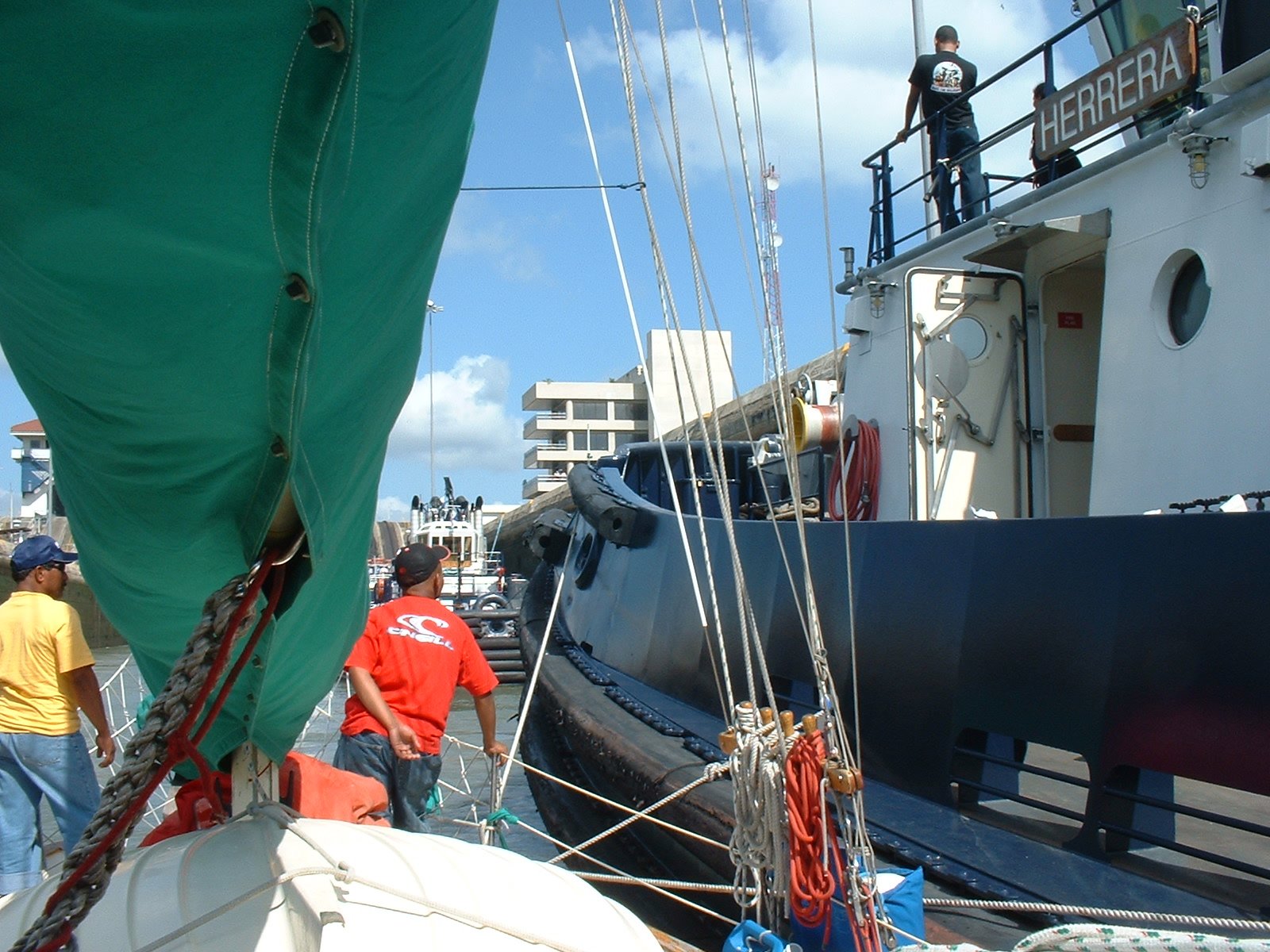Tied alongside the tug. We went up the Miraflores and Pedro Miguel locks tied alongside the tug Herrera -- "Smith" -- which made our lives easier, as the tug took care of adjusting its mooring lines as the lock rose. Our professional line handlers are in the front of the boat; Luis (father, left) and Luis (son, right).