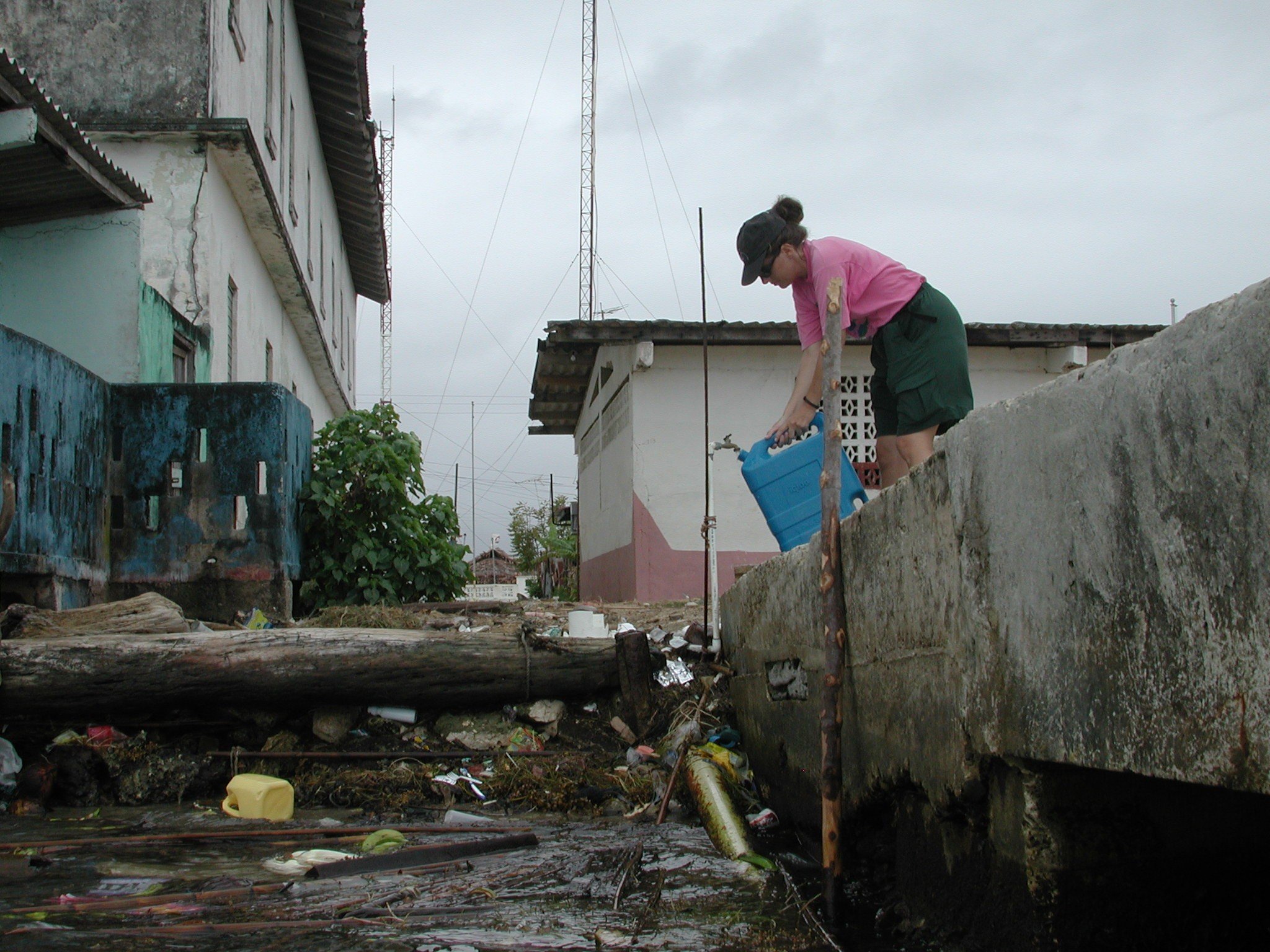 Getting water from the town facility. This is where boats can get water, at a public tap by a concrete pier. The waterfront isn't the best part of Nargana.