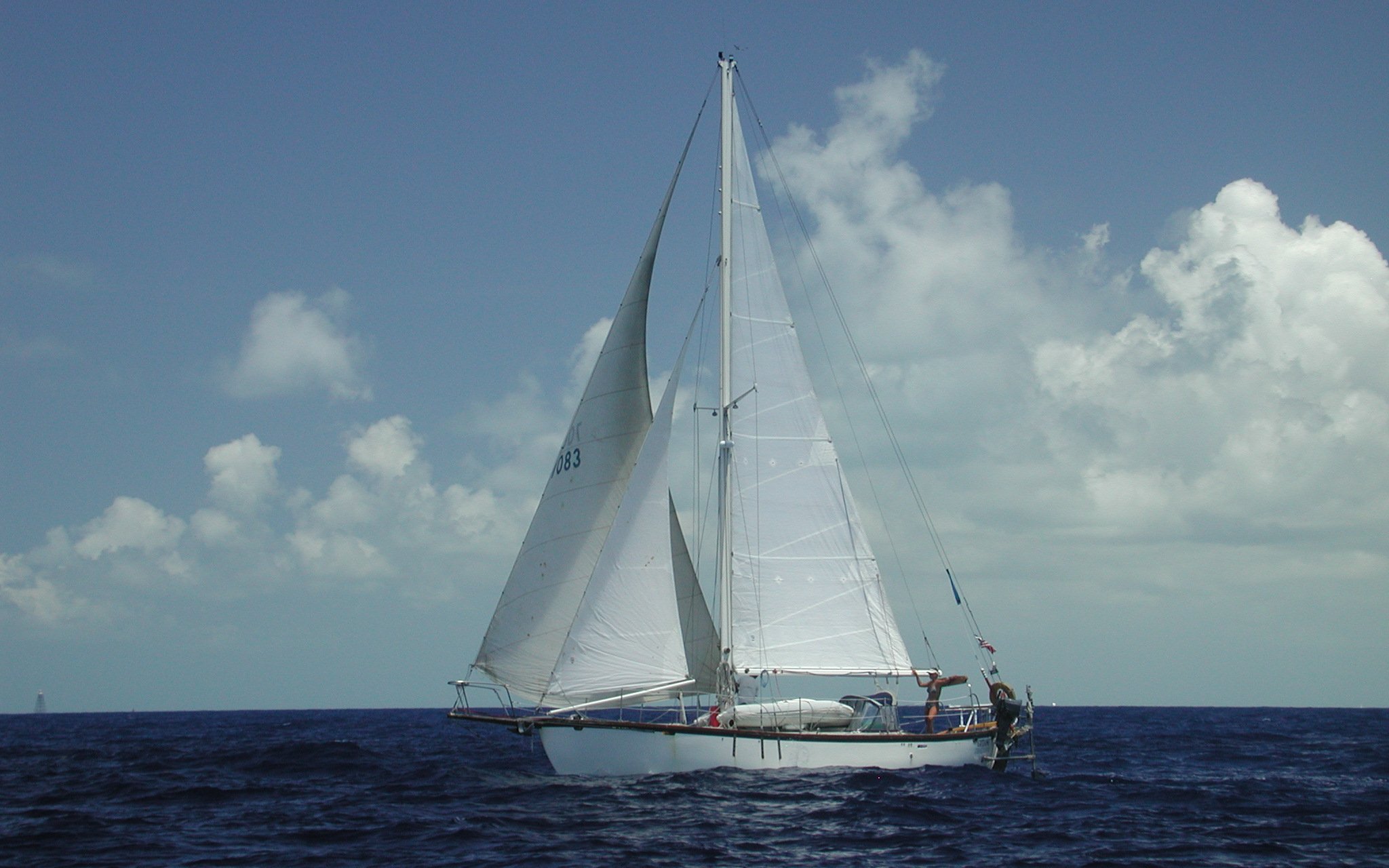 Jenny in the cockpit of Gitane. Taken from Moonrise while Gitane and Moonrise were sailing from Key West to Looe Key.