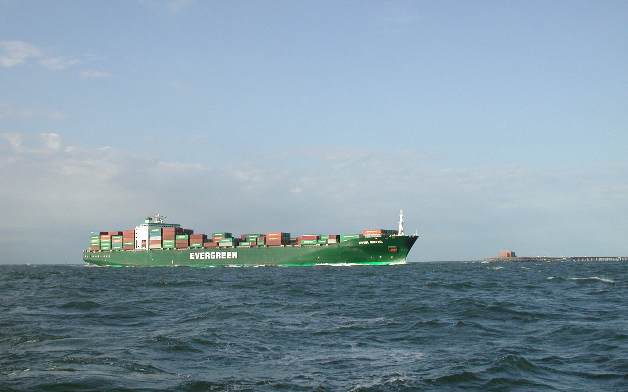 A ship entering the Chesapeake Bay past the bridge-tunnel (visible on right), just after us.