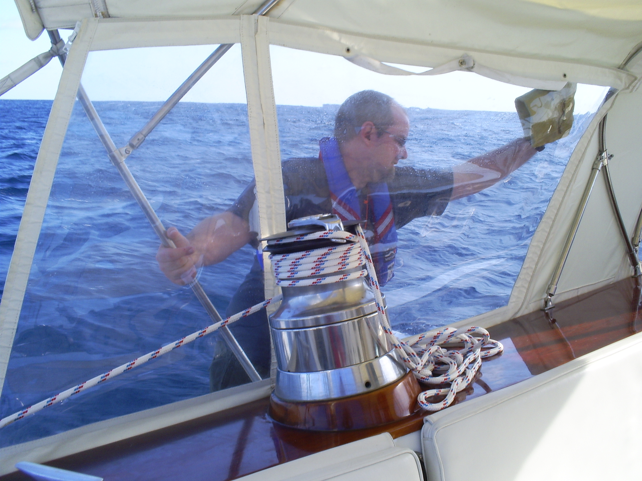 Ian getting the massive salt build-up off the bimini windows. By Matt.