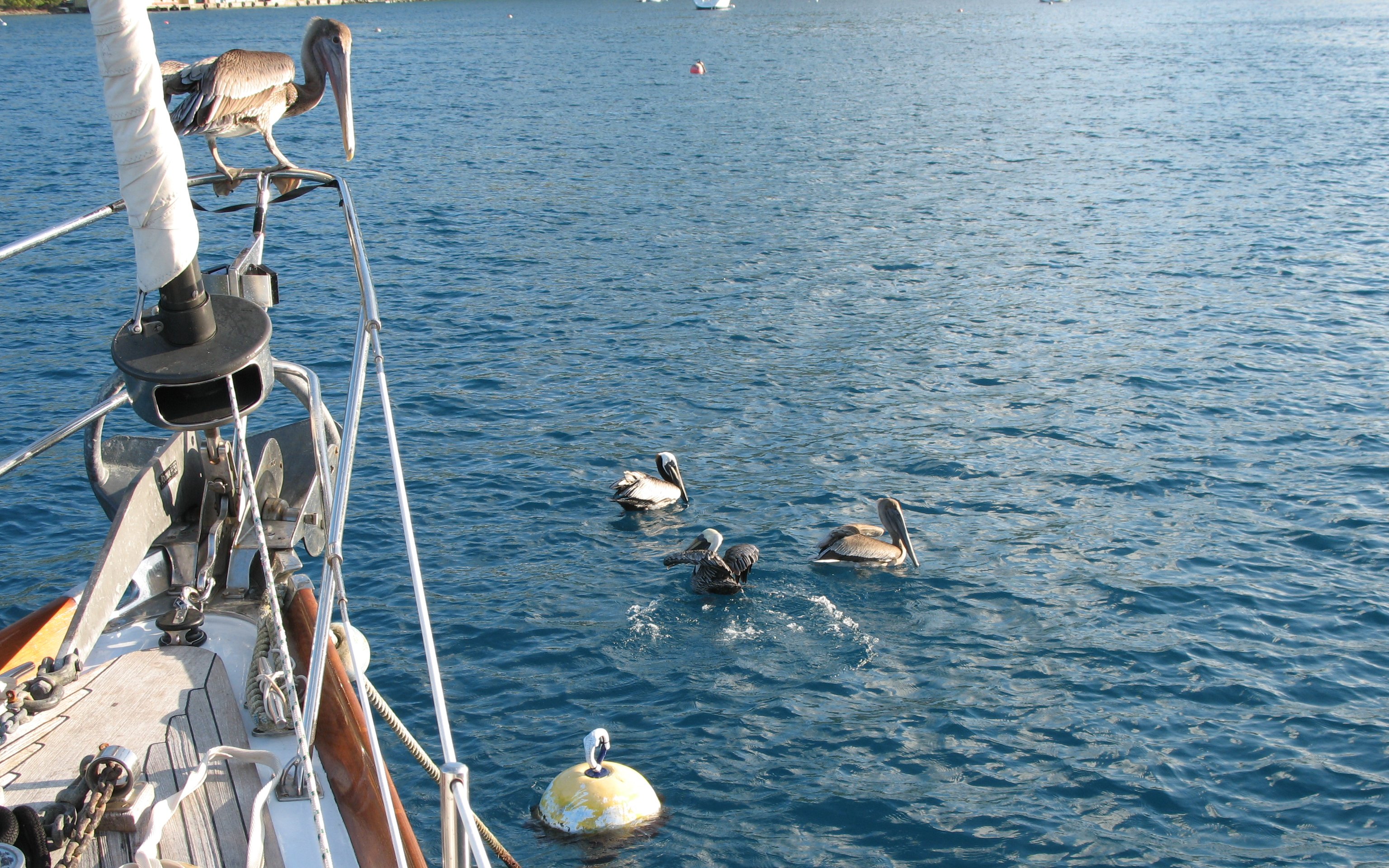 Pelicans around the boat, in Sopers Hole, Tortola.