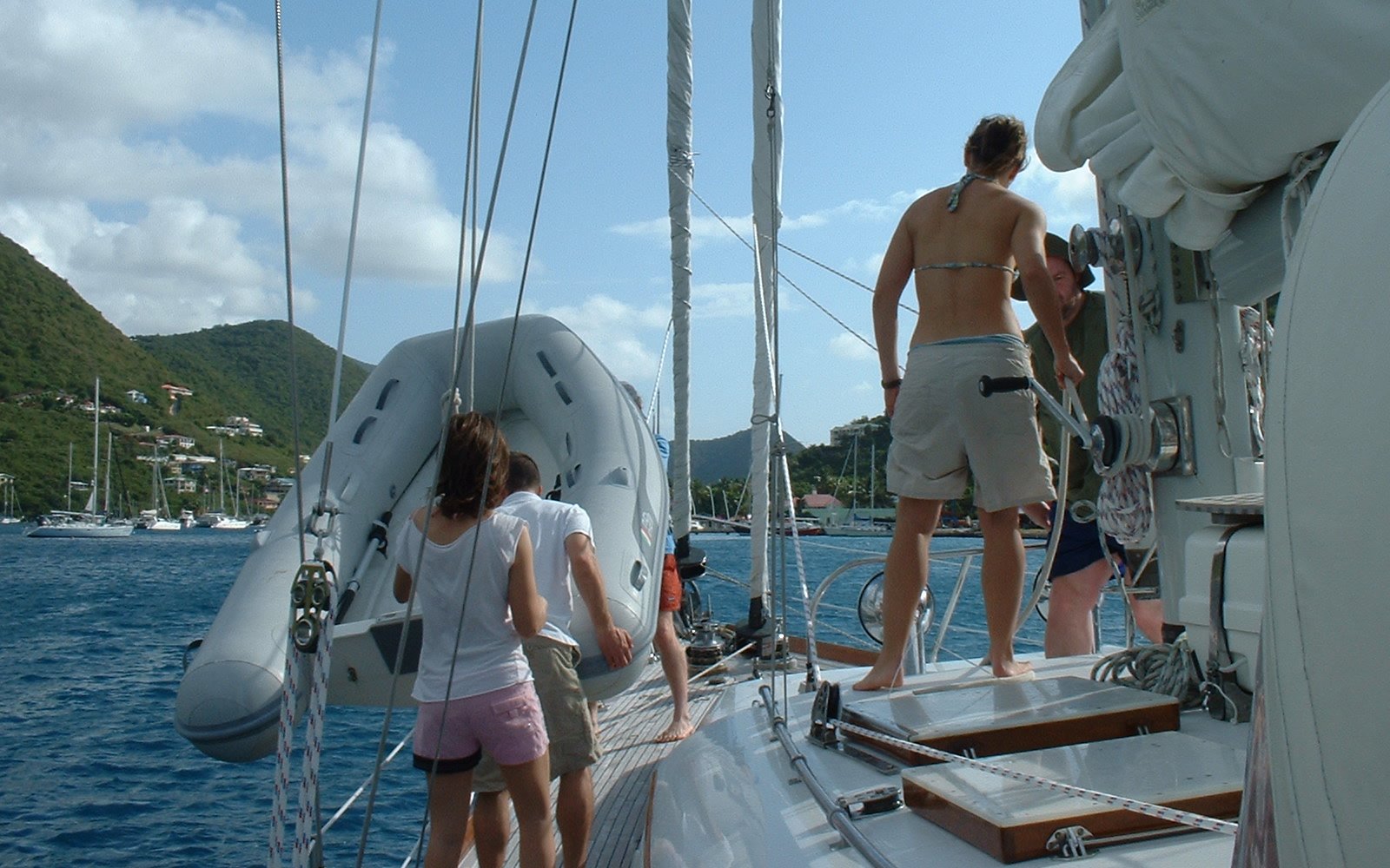 Debbie, J, Matt, Jenny and Ian launching the dinghy. By Rachel.