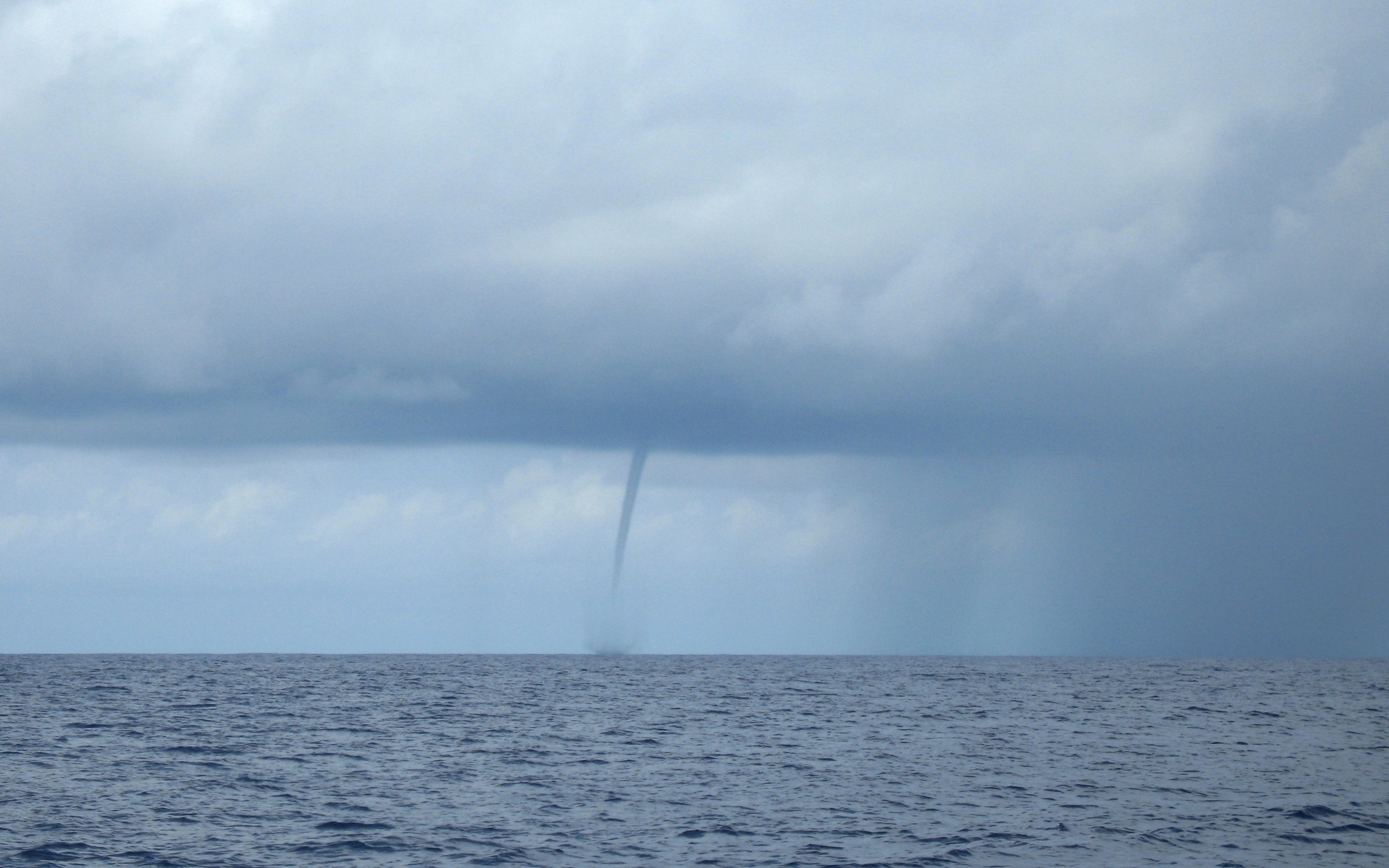 A waterspout in the distance... fortunately. This was it just as it touched down.