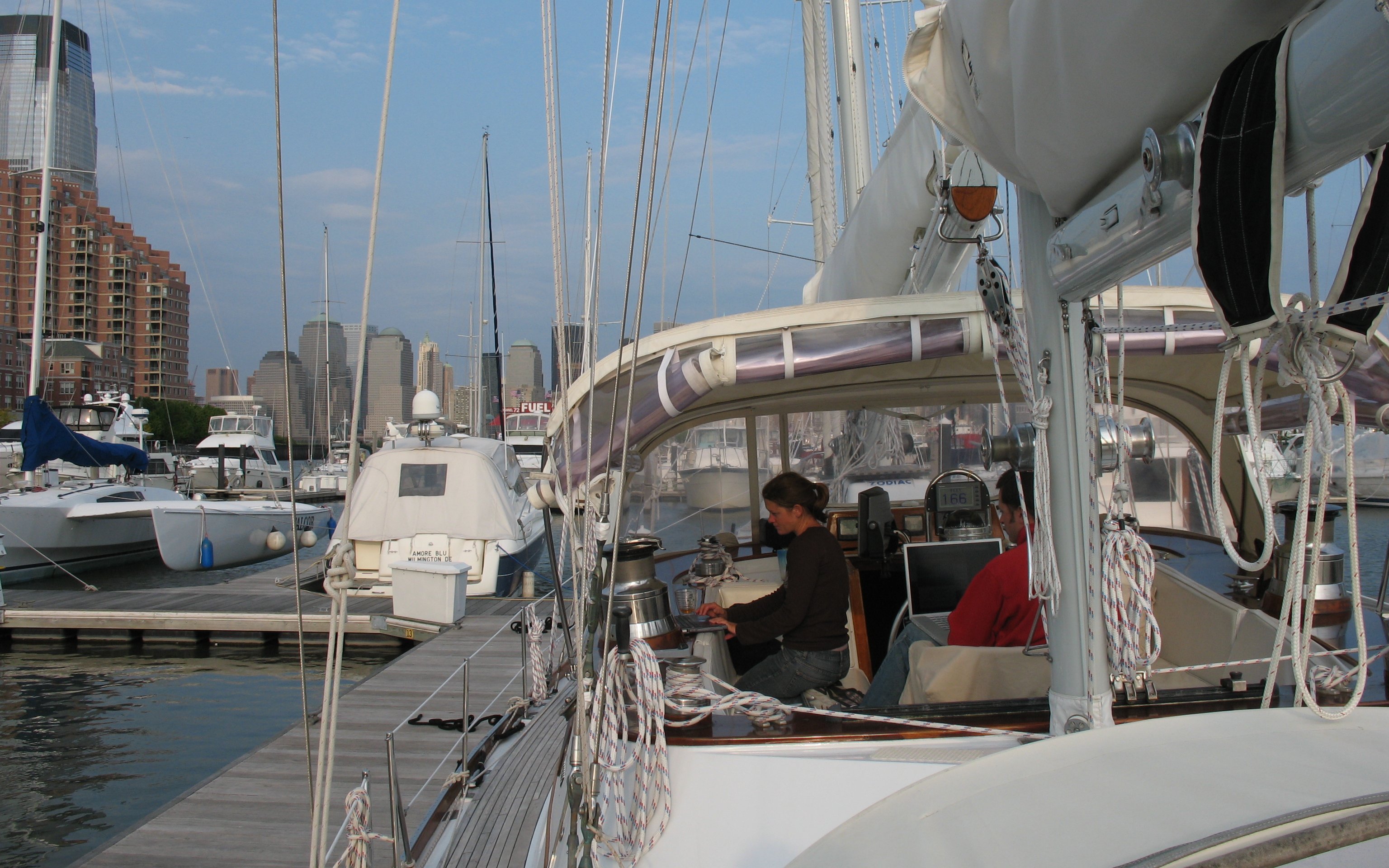 Docked at Liberty Landing Marina in Jersey City, and Jenny and J are surfing the net.