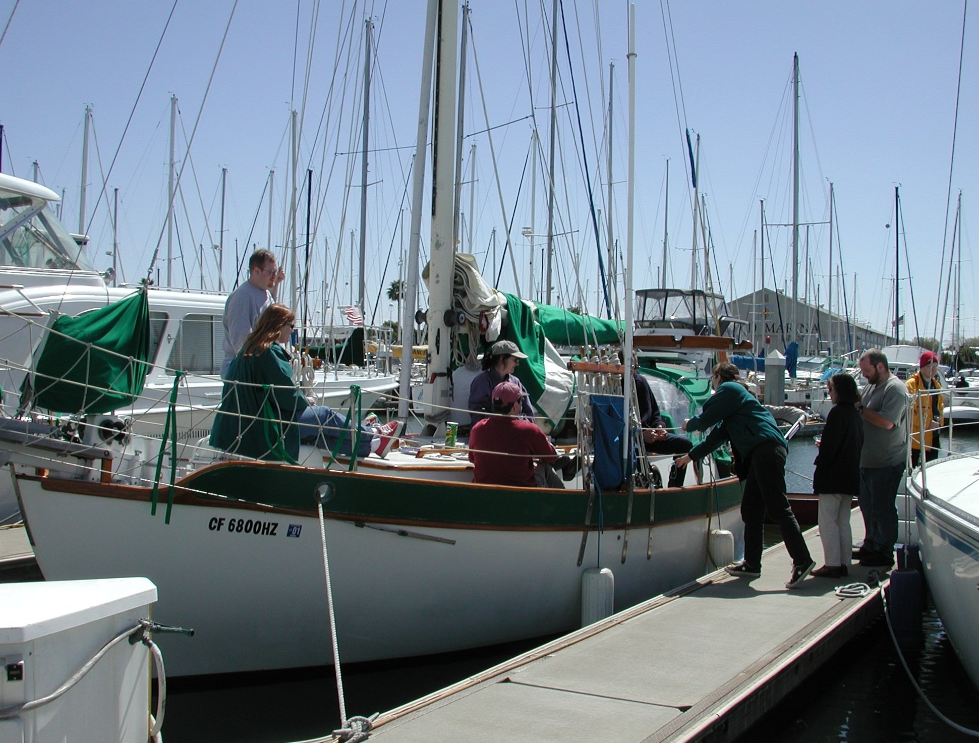 Moonrise's christening On deck: Robb, Jo, Zoe (back) and Adrian. On the dock: Liz, Paola, Clint, and Simon behind. Grand Marina, Alameda