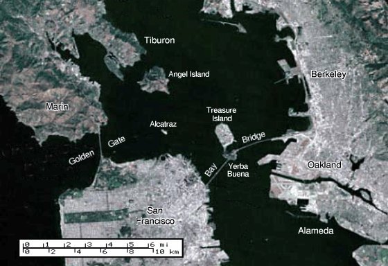 It takes about 50 minutes to get from Alameda into the Bay proper; it's generally a case of motoring, since it's usually upwind, and tacking a large boat up a narrow channel through heavy traffic (it's pretty busy) isn't much fun. Once there, there's the choice of staying south of the Bay Bridge, in generally lighter winds (not always, depending on the wind pattern), or heading north into The Slot between SF / Treasure Island and Marin / Angel Island. This is where the big wind is, dependably 25 knots on a summer afternoon -- and a cold wind, too. But just to the north, around the back of Angel Island is Raccoon Strait, which almost always has very light wind and plenty of sunshine and warmth -- just an example of how the weather patterns vary in the bay.